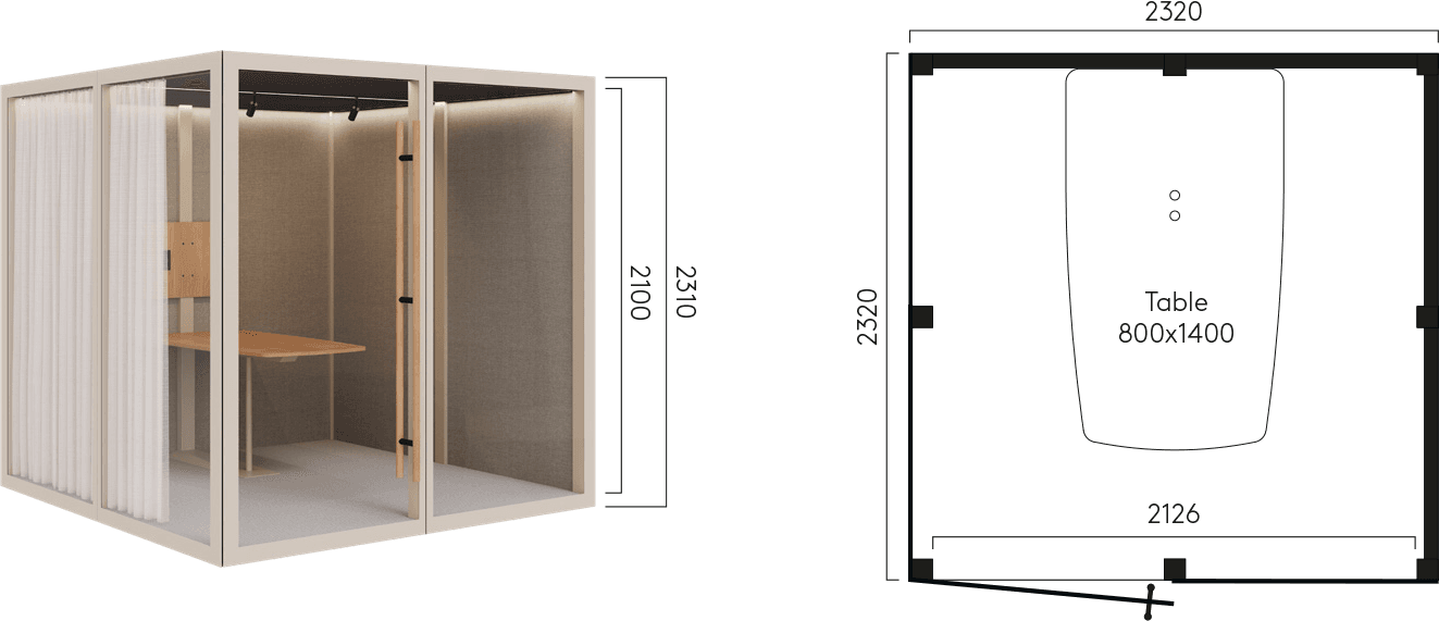 Zen Pod Large is available in Clean configuration, delivered unfurnished, or as Conference, including a custom table in optimized size for Zen Pod Large and a TV mount. The Conference configuration can be complemented with Atlas Air chairs.