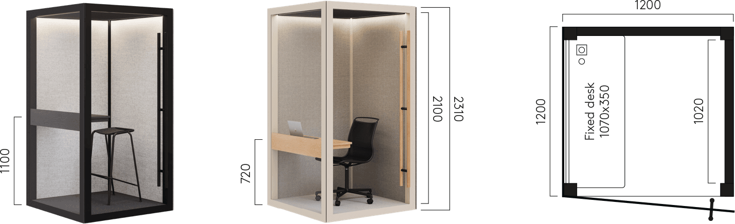 Zen Pod Small is available in Clean configuration only, delivered unfurnished with a fixed tabletop. Smart add-ons for Zen Pod Small include the Lammhults A22 stool with black frame, including cushion, and the Lammhults Atlas Air chair with 5-star base on wheels in black. Customized furniture and accessories can be purchased separately.